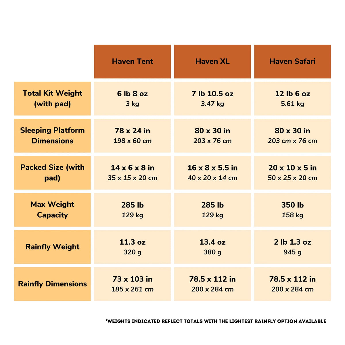 HAVEN TENT: 78x24 dimensions. Ripstop Nylon waterproof hammock tent. Total kit weight 7 lbs. Our hammock tent packs small and is easy to put away.
