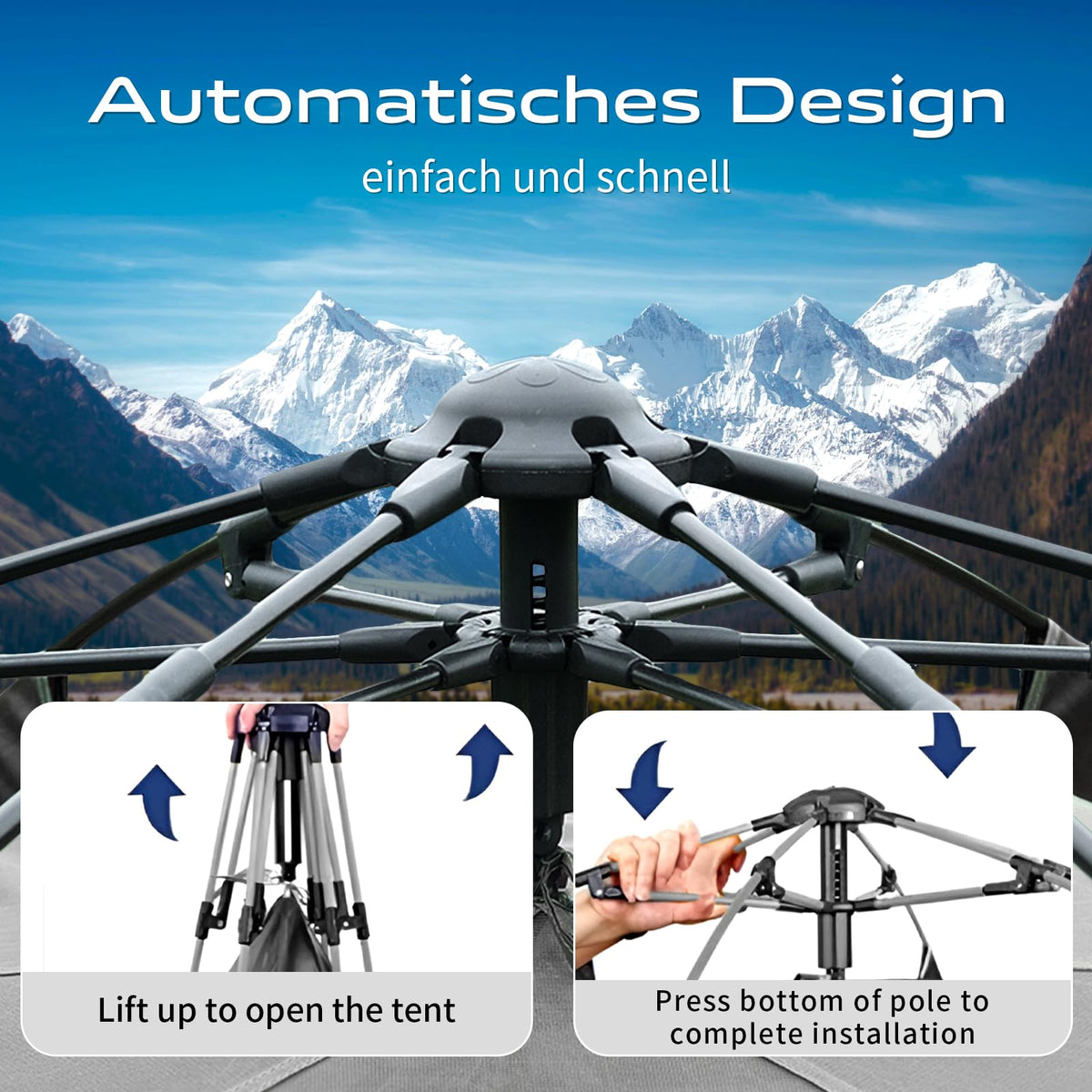 Installation design: Simple disassembly quick installation Open the top of the tent, according to the picture shows, just lift the top, open the mechanical device, and then fix the joint at the bottom in place, press down the position of the rod and spring instantaneously automatic installation